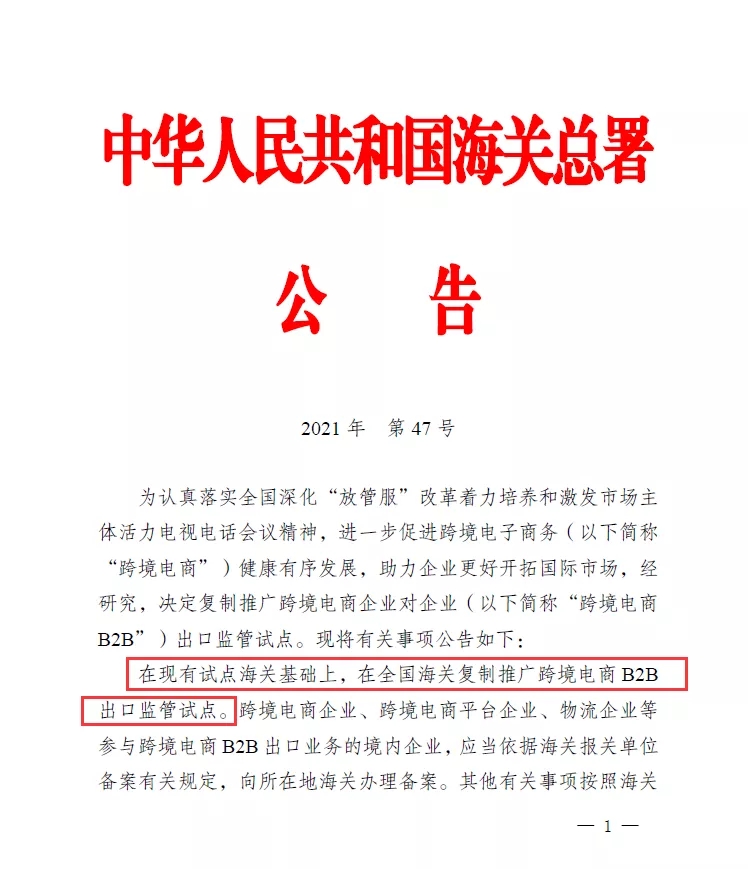 近日,中国海关总署发布公告2021年第47号(关于在全国海关复制推广跨境电子商务企业对企业出口监管试点的公告),要求在现有试点海关基础上,在全国海关复制推广跨境电商B2B出口监管试点。这意味着“9710”和“9810”海关监管模式将在全国范围内推广。